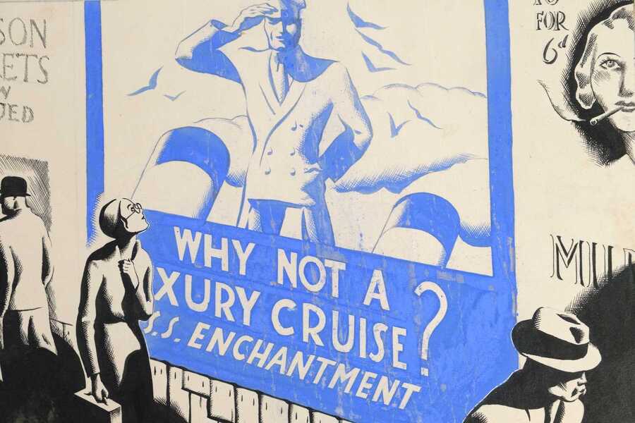 In addition to illustrations for his own books, Wragg enjoyed a varied career as a commercial artist and magazine illustrator. The present work forms part of a storyboard that Wragg put together for Nash’s Magazine and was reproduced there in the edition for July 1934. In the story, Wragg narrates the tale of a lowly secretary who is seduced by an advertisement for a luxury cruise which she takes, subsequently embarking on an onboard romance. Nash’s Magazine was published monthly from 1909 until 1937 and was richly illustrated by many leading artists of the day including Eric Fraser, Rowland Hilder and Dean Cornwell.